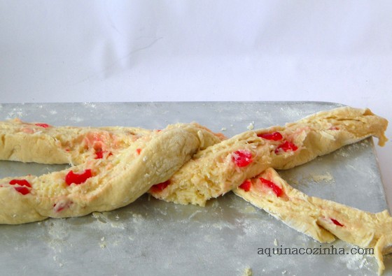 Polvilhe uma superfície com farinha de trigo e abra a massa em um retângulo, pode ser com um rolo, com uma garrafa ou com a mão mesmo. Espalhe o recheio de coco por cima, espalhe as cerejas cortadas em fatias e enrole como um rocambole. Corte o rolo no sentido do comprimento (veja a foto 7). Depois, começando pelo meio, enrole até as pontas (veja a foto 8). Coloque em uma forma untada com um tiquinho de óleo e deixe fermentar até dobrar de tamanho, cerca de 1 hora. Leve ao forno médio (cerca de 180 graus) até dourar (mais ou menos 30 minutos).