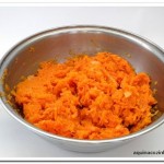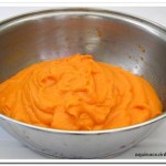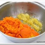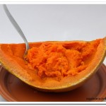 Depois de cozida, com a ajuda de uma colher vá retirando a polpa da abóbora cozida (foto 2) e reserve. Se cozinhar no fogão, escorra e amasse com um garfo.